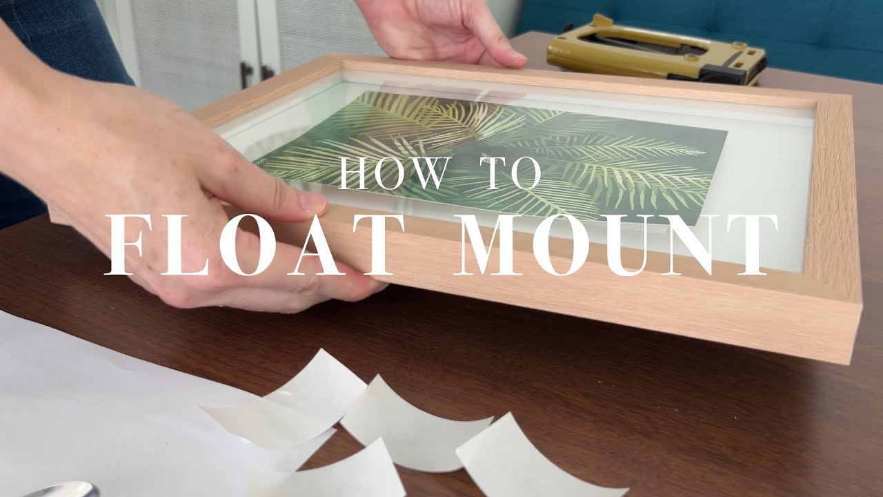 Mesmo que o termo assuste, o float mounting é executado com movimentos bem simples: recortar o foam board um pouco menor que a arte, colar esse foam board no fundo, criar dobradiças com a fita para fixar apenas a parte de cima do papel e deixar a parte de baixo solta para que o papel possa expandir e contrair sem enrugar. Em seguida, ela constrói pequenos espaçadores com tiras de mat board para criar o “respiro” entre a arte e o vidro, o que dá a sensação de quadro mais sofisticado, típico de molduras do tipo shadow box.